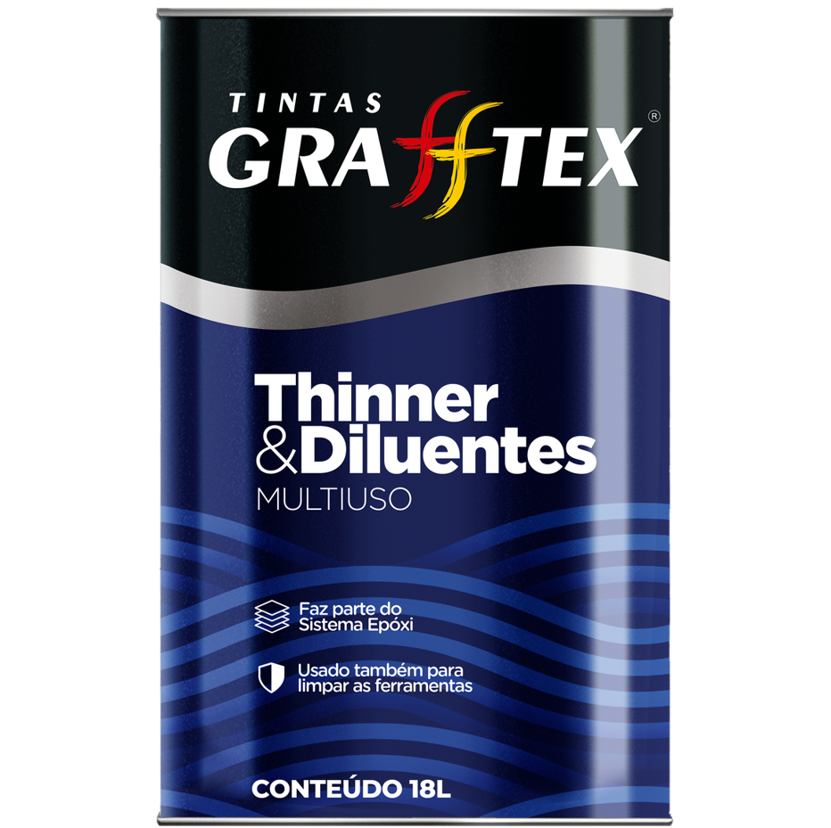 GRAFFTEX THINNER 200 S SINTÉTICO é ndicado para diluição de esmalte sintético, industrial, tintas óleo, vernizes, primers e limpeza em geral, pistolas e ferramentas utilizadas na pintura imobiliária ou industrial. Composição: Hidrocarbonetos aromáticos e alifáticos, álcoois e ésteres.