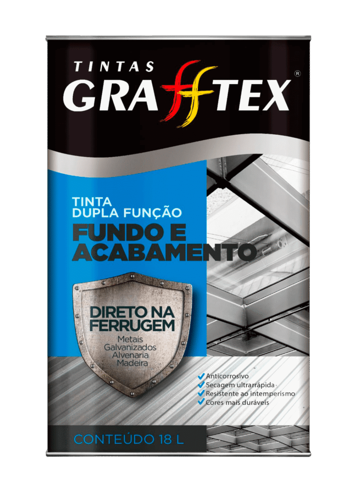 GRAFFTEX TINTA DUPLA FUNÇÃO FOSCA é uma tinta dupla função, ou seja, fundo e acabamento (proteção e decoração). Para uso interno e externo indicado para aplicar em superfícies metálicas ferrosas, tais como aço carbono, galvanizados, zincados etc. A secagem é extra rápida, com bom poder de cobertura, rendimento fácil aplicação. Seu acabamento pode ser de aspecto brilhante, acetinado ou fosco.